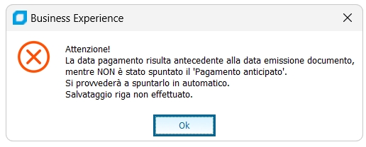 Il check Pagamento anticipato è gestibile manualmente da parte dell'utente ed è usato quando la fattura è pagata in data antecedente rispetto alla data del documento. Se non spuntato allora la data pagamento deve essere sempre maggiore o uguale alla data documento. Se la data pagamento è inferiore alla data documento allora deve essere spuntato Pagamento anticipato.