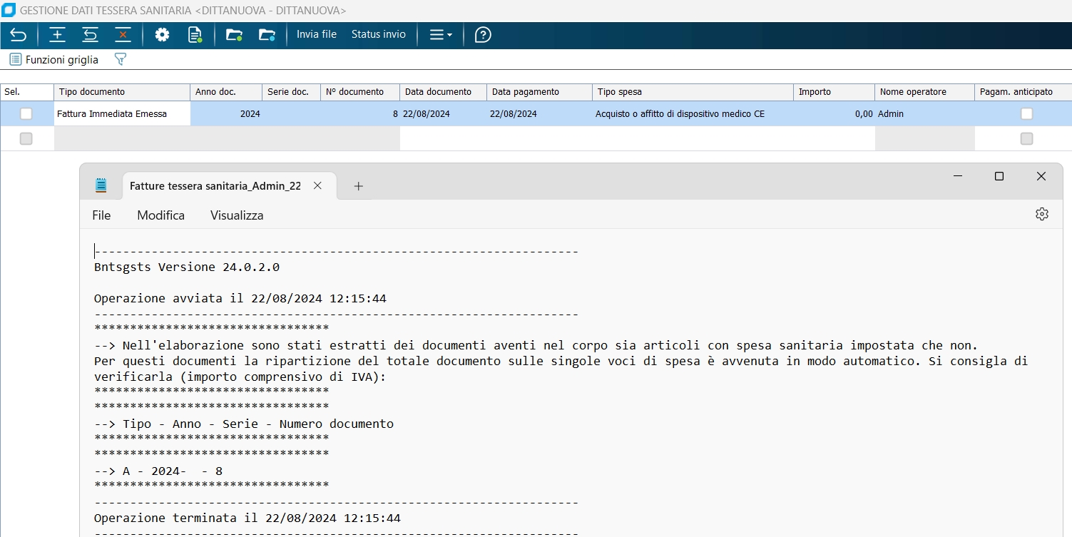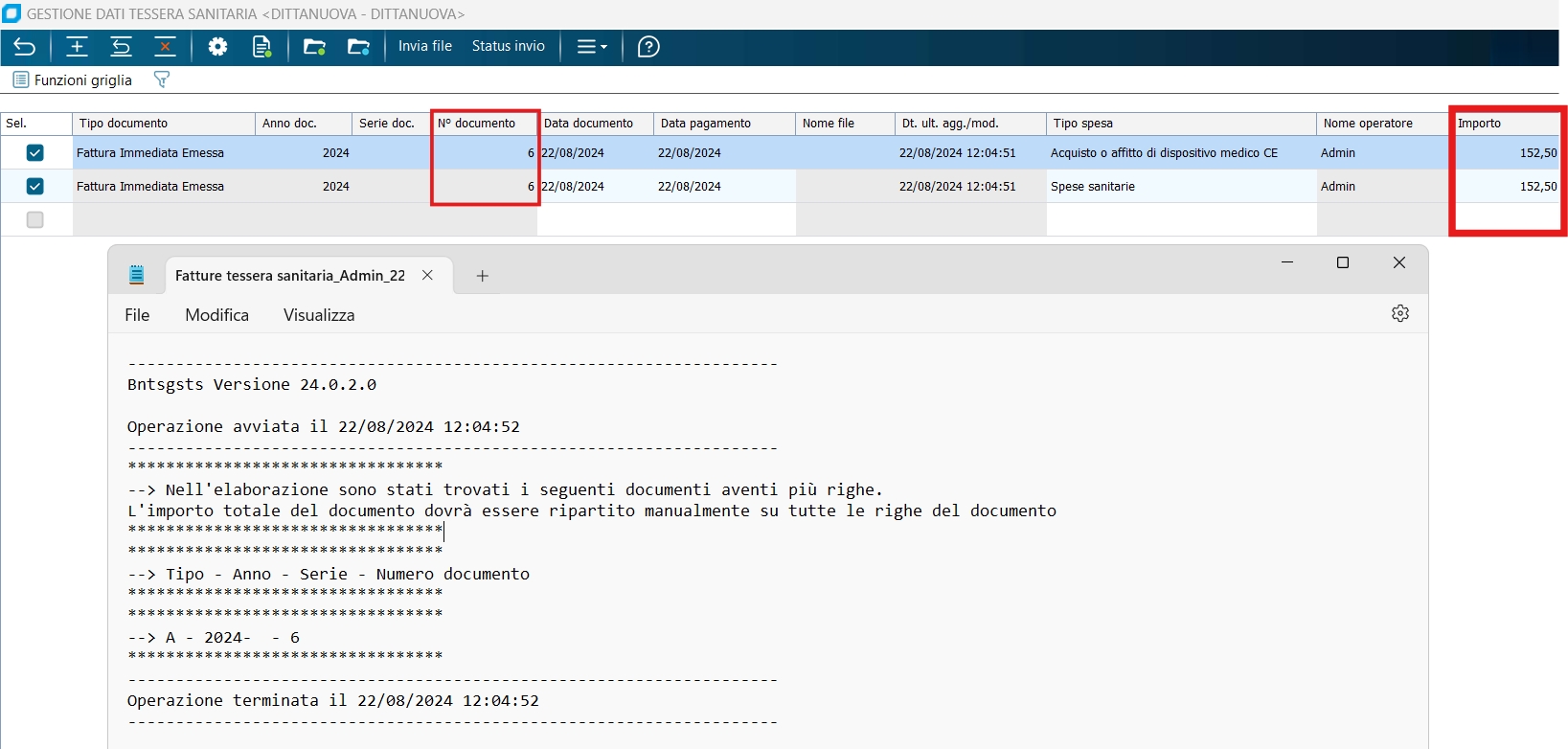 Nel caso in cui sul documento di magazzino sono stati inseriti più articoli (sia con articoli gestiti in tessera sanitaria sia non) al termine dell'elaborazione del programma TS, sugli articoli gestiti in tessera sanitaria non viene inserito l'importo e viene dato un messaggio di log.
