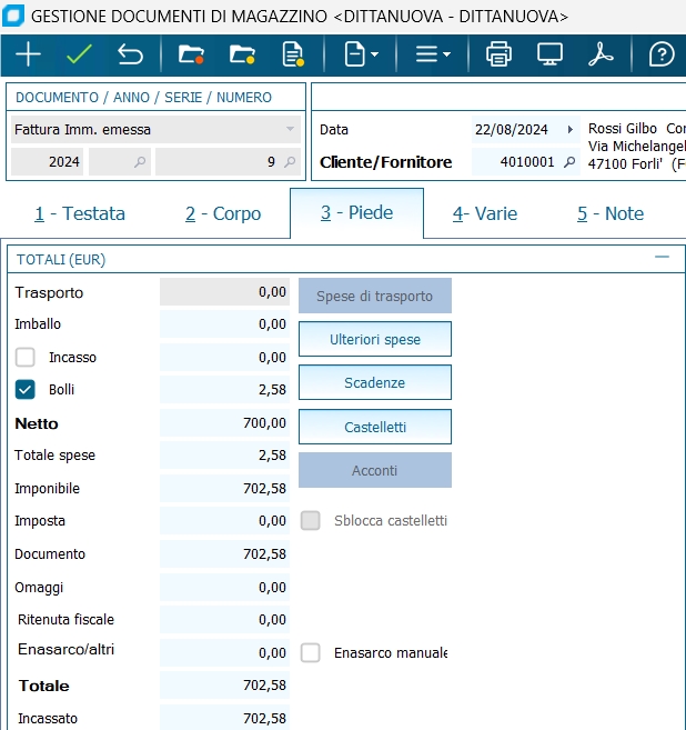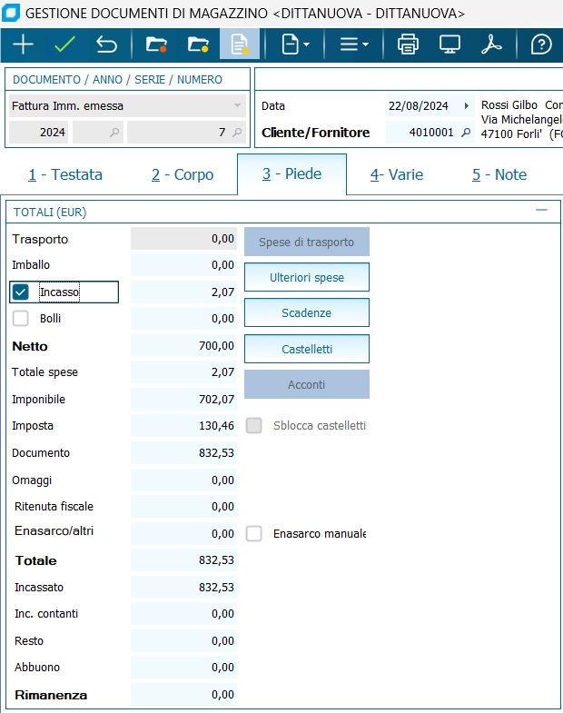 N.B Con tale opzione sopra descritta attiva, è possibile, nei documenti con più tipi spese, poter calcolare in automatico il valore di ogni tipo spesa.