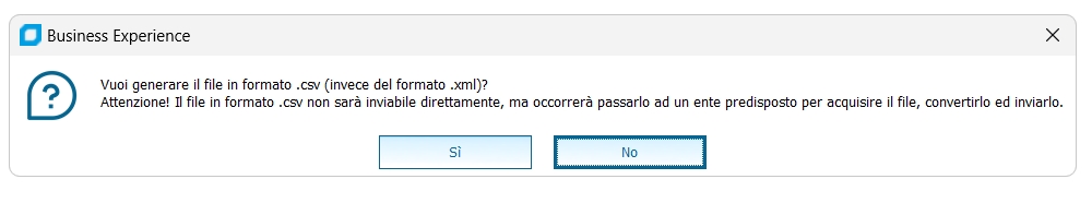 È stata aggiunta la possibilità di generare il file in formato .csv al posto del formato .xml, cliccando su genera file si chiede all'utente se, al posto del file xml, si vuole generare un file in formato csv.