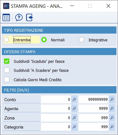 Opzioni stampa Flag Suddividi "Scaduto" per fasce (default spuntato) e Suddividi "A Scadere" per fasce (default non spuntato), i due flag operano in base a 2 opzioni di registro BSTXAGEI\OPZIONI\ScadutoFasce (default 30;60;90;120;150;180;365) e BSTXAGEI\OPZIONI\AScadereFasce (default 15;30;60;90) e funzionano in questo modo, se ad esempio vengono indicati i valori "15;30;60;90" le fasce saranno le seguenti: