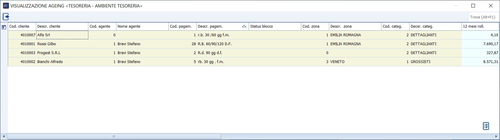 Cod. Pagamento è il codice pagamento di anagrafica cliente Status blocco: da anagrafica cliente. In stampa su griglia, in caso di insoluto, il programma aggiorna automaticamente lo stato di blocco conto dell'anagrafica senza rilasciare nessun avviso. E' presente, però, un'opzione di registro BSTXAGEI\OPZIONI\AggiornaBloccoContiSintesiStat (0\-1 <--default) che se disattivata NON procede con l'aggiornamento dello stato di blocco. 12 mesi rolling: è il valore di fatturato degli ultimi 12 mesi, a partire dall'ultimo mese chiuso rispetto alla data di lancio. Se lancio l'ageing in data 15 Ottobre, i mesi di rolling vanno dal Ottobre dell'anno precedente a Settembre dell'anno in corso. 12 mesi roll. a.p.: è il valore di fatturato degli ultimi 12 mesi dell'anno precedente, e quindi, riprendendo l'esempio sopra, è il fatturato che va da Ottobre di due anni prima a Settembre dell'anno precedente. 3 mesi rolling: è il valore di fatturato degli ultimi 3 mesi, a partire dall'ultimo mese chiuso rispetto alla data di lancio. Se lancio l'ageing in data 15 Ottobre, i mesi di rolling vanno da Luglio dell'anno in corso a Settembre. 3 mesi rolling a.p.: è il valore di fatturato degli ultimi 3 mesi dell'anno precedente, e quindi, riprendendo l'esempio sopra, è il fatturato che va da Luglio a Settembre dell'anno precedente Il concetto di rolling permette così di avere un valore di fatturato sempre confrontabile con l'anno precedente, anche durante l'anno, e i 3 mesi servono per quelle aziende che hanno un'accentuata stagionalità nel fatturato. Analisi dello scaduto: