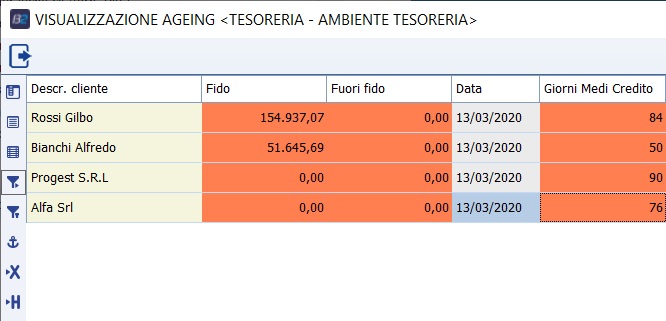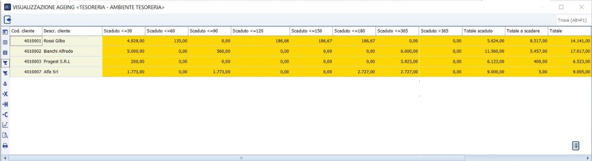 Il Programma Stampa Ageing permette di avere la posizione debitoria del cliente (scaduto e scadere) in formato Griglia facilmente esportabile in Excel. In particolare, per ogni codice cliente, lo scaduto viene suddiviso in fasce di 30 giorni fino a 180 giorni e oltre 180 giorni. In aggiunta a tali informazioni sono state inserite dati di fatturato e Fido che andremo più avanti ad analizzare nel dettaglio. Griglia di selezione: