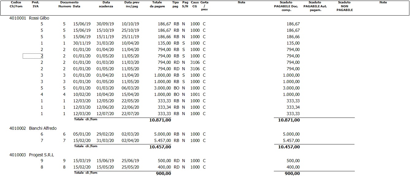 1. Report di scandenziario : elenco scadenze suddivisi per cliente e con valori suddivisi in base alle note autorizzative. In tale scadenzario sono comprese anche le scadenze extra-contabili.