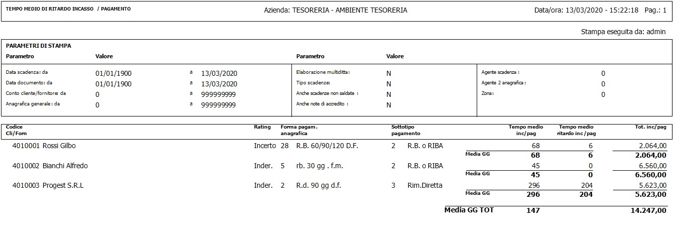 2. Tempo medio di rit incasso pagamento: elenco per cliente/fornitore basato sull'analisi storica dei pagamenti/incassi effettuati. Vengono riportati i giorni medi di incasso complessivi (da data documento a data effettivo pagamento/incasso) e giorni di ritardo (da data scadenza a data effettivo pagamento/incasso), ponderati per il valore del pagamento. Sono esclusi dal calcolo le scadenze raggruppate, in quanto raggruppando più documenti con data documento diversa, non avrebbero una data documento valida al fine del calcolo.