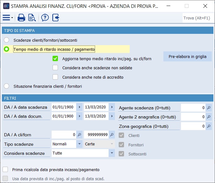 È resente, inoltre, la possibilità di pre-elaborare in griglia i dati mostrati lanciando la stampa "Tempo medio di ritardo incasso/pagamento". Il pulsante "Pre-elabora in griglia" è abilitato solo se si seleziona questo tipo di stampa ed è spuntato "Aggiorna tempo medio inc./pag. su cli./forn". Con la pre-elaborazione, si vedono in griglia i tempi medi di ritardo dei conti spaccati per sottotipo pagamento e tutti i dati non sono modificabili. In particolare sono mostrati: