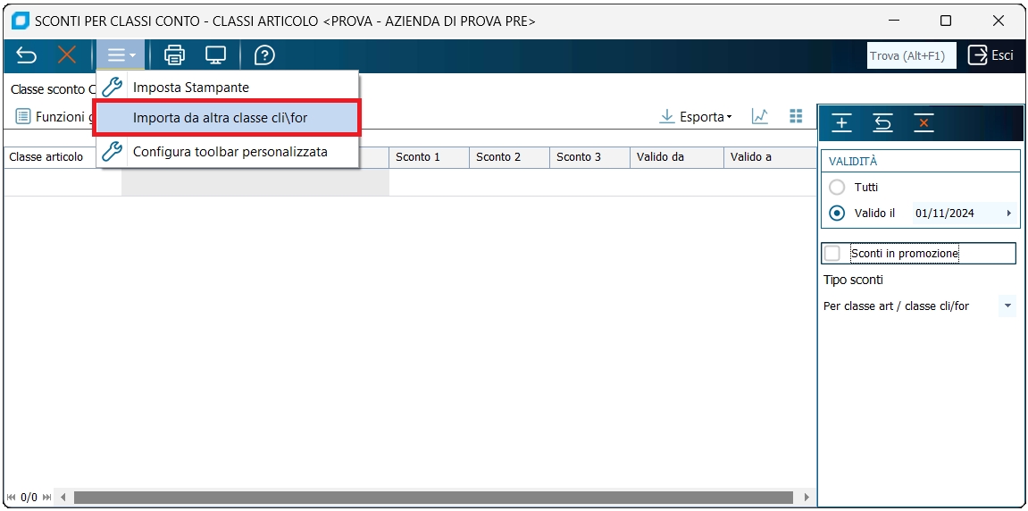 Con la funzione "Importa da altra classe cliente fornitore" è possibile, data una classe sconto clienti fornitori senza righe (quindi vuota), righe da un'altra classe sconto cliente fornitore.