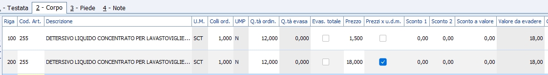 Pulsanti in toolbar Ripristina (F8) Permette di tornare alla finestra di selezione dei cataloghi. Duplica Consente di duplicare il catalogo sul quale si è posizionati, creando un nuovo catalogo con codice, descrizione, data inizio/fine validità personalizzabili. Stampa / Stampa a video (F6 / F12) Vengono stampate su carta o a video tutti i cataloghi validi/applicabili all'utente e le relative condizioni filtrate precedentemente Nel menu Strumenti Seleziona/Deseleziona tutto Permette di selezionare tutte le righe di "Condizioni" del catalogo su cui si è posizionati. Copia righe Permette di copiare tutte le righe selezionate. Incolla righe Permette di incollare in un altro catalogo le righe precedentemente copiate. Attenzione! Condizioni copiate da un catalogo con date di validità differenti/scadute verranno incollate con le date di inizio/fine validità del contratto di destinazione. Inoltre verranno scartate condizioni che hanno le stesse validità di condizioni già presenti nel catalogo (ad es.: una condizione per lo stesso articolo, nella stessa unità di misura), al pari di ciò che avviene in fase di inserimento manuale di una condizione. (*): per gestire prezzi e sconti per UM è necessario abilitare l'opzione globale "AbilitaPrezziUM" ed è necessario che l'articolo movimentato gestisca il prezzo di vendita diverso dall'UM principale, in questo modo sulla riga del documento (offerta, ordine, bolla, fattura) sarà spuntato il check-box "Prezzi x U.d.M.".