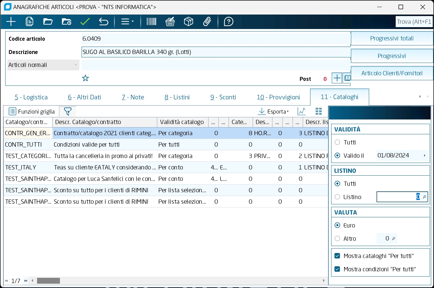 A partire da Business Experience in "Anagrafiche clienti/fornitori" e in "Anagrafiche articoli", se attiva la "Gestione avanzata prezzi-sconti" in anagrafica ditta, è disponibile un nuovo tab dal nome "Cataloghi" che mostra in sola visualizzazione i cataloghi/contratti e le relative condizioni valide per il conto o l'articolo selezionato. È opportuno evidenziare come sia in anagrafiche clienti/fornitori che in "Anagrafiche articoli" non vengono mostrati i soli cataloghi/contratti e condizioni strettamente legati al conto o all'articolo oggetto della selezione, ma anche cataloghi/contratti e condizioni che vengono applicate indirettamente; ad es.: articolo "SUGO AL BASILICO BARILLA 340 gr." che appartiene al gruppo "ALIMENTARI", sottogruppo "SUGHI", verranno mostrate tutte le condizioni valide per il codice dell'articolo selezionato, o del gruppo merceologico, o del gruppo/sottogrupo merceologico, per la marca dell'articolo, per il codice classe sconto eccetera. Tra i possibili filtri applicabili a destra: