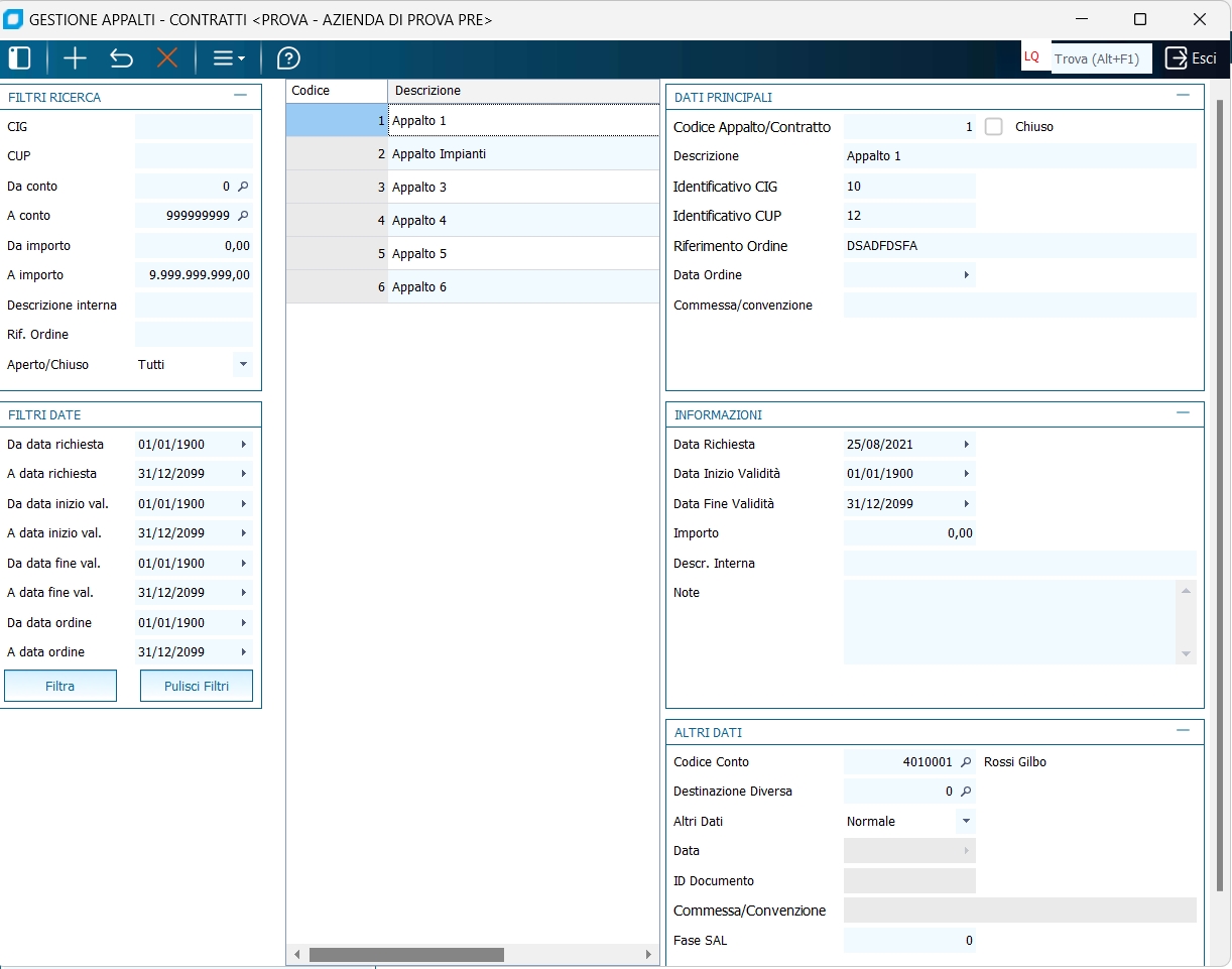 Moduli richiesti: Modulo Base Con questo programma č possibile effettuare la creazione dei contratti/appalti. E' stata predisposta una tabella che consente di organizzare i vari contratti/appalti al fine di gestire i codici CIG/CUP ed i riferimenti ordini obbligatori per le transazioni commerciali verso la Pubblica Amministrazione e verso sub-appaltatori delle stesse. Inoltre tramite questo programma sarā possibile effettuare la gestione dei contratti per le transazioni verso le aziende private. Viene consentito il collegamento diretto tra il contratto/appalto e la relativa anagrafica fornitore con cui č in essere.
