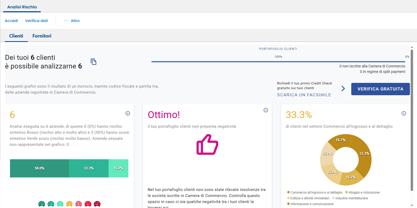 In questa sessione è possibile visionare una situazione complessiva della rischiosità del proprio portafoglio, clienti/fornitori. Vengono visionate le partite iva dei clienti/fornitori movimentati negli ultimi 12 mesi. Per vedere questa pagina, è necessario avviare il programma Estrazione dati Analisi Sintetica clienti/fornitori . E, successivamente, inviare i Invio Dati a NTS Cloud Tech con l apposita funziona. Inoltre sul NCT è necessario attivare il modulo NCT Experience (modulo gratuito che mette in comunicazione Business con NCT per la consultazione di anagrafiche e tanti altri servizi)