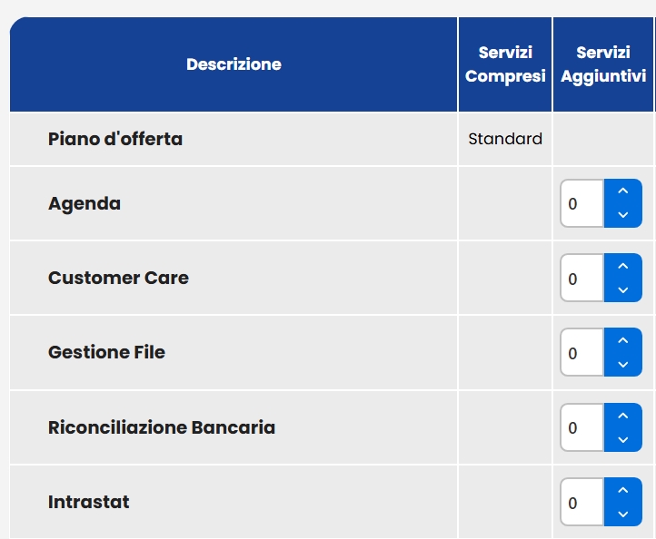 In questa sezione di NCT Experience, si attivano una serie di funzionalità incluse con Business Experience che permettono di integrare NCT a Business. In particolare si attivano: - le Anagrafiche Plus: permette quindi di poter consultare da NCT le anagrafiche clienti e fornitori, per poter ad esempio visionare il numero di telefono. Si possono poi integrare alcuni dati statistici. Per quest'ultima funzioanlità è necessario lanciare in Business la funzione Estrazione Dati Analisi Sintetica e inviare poi i dati a NCT attraverso l'Invio dati NCT. Tale modulo, una volta attivo, apparire sul menu NCT come Anagrafiche.Inoltre con questa attivazione, si attiva anche la possibilità di visionare il livello di rischiosità del portafoglio (dato aggregato), fornito da Anticipay. - Agenda: permette di sincronizzare i calendari e la Rubrica di Business e eventuali Calendari e Contatti di Office 365 (previa configurazione). I calendario di Business necessitano del modulo Customer Care (Customer Service e CRM) - CRM Plus: permette di vedere le attività del CRM e le chiamate del CS - Gestione File: permette di sincronizzarsi con account OneDrive e SharePoint. Questo permette in Business di poter salvare file su cartelle oneDrive o SharePoing con il vantaggio della condivisione nativa Microsoft. - Riconciliazione Movimenti Bancari: permette di aggiungere l integrazione SaltEdge (Business Open Banking - BOB), al modulo Riconciliazione Movimenti Bancari. Necessità del modulo attivo anche in Business. - Intrastat NCT: attiva la nuova modalità di estrazione e gestione dell intrastat NCT. Clliccando su Seleziona in fondo alla pagina, sarà possibile indicare quali dei Moduli NCT sopra indicati attivare. Le anagrafiche Plus sono le uniche che non richiedono un' espressa indicazione di attivazione, ma si attivano a prescindere. Per gli altri moduli invece è sufficiente indicare 1 nella colonna Servizi Aggiuntivi.