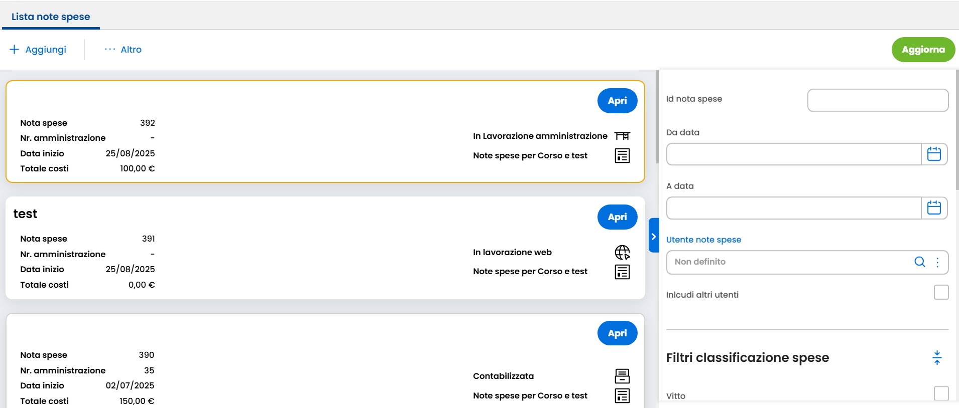 Cliccando su Apri si ha poi la possibiltà di entrare su una nota spesa ed aggiungere le singole spese.
