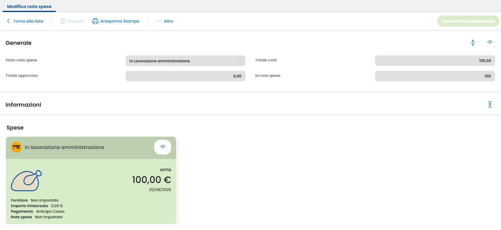 dalla quale è possibile, stampare un Anteprima di stampa oppure Rimuovere una nota spesa (incluse tutte le spese associate). Tale rimozione e' possibile solo se la nota spesa e' in status "in lavorazione web"