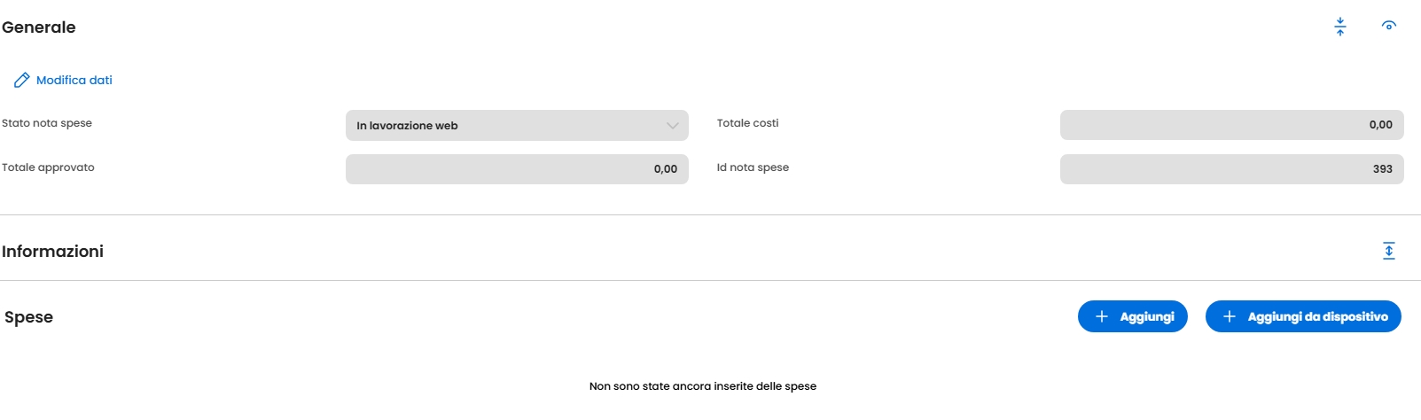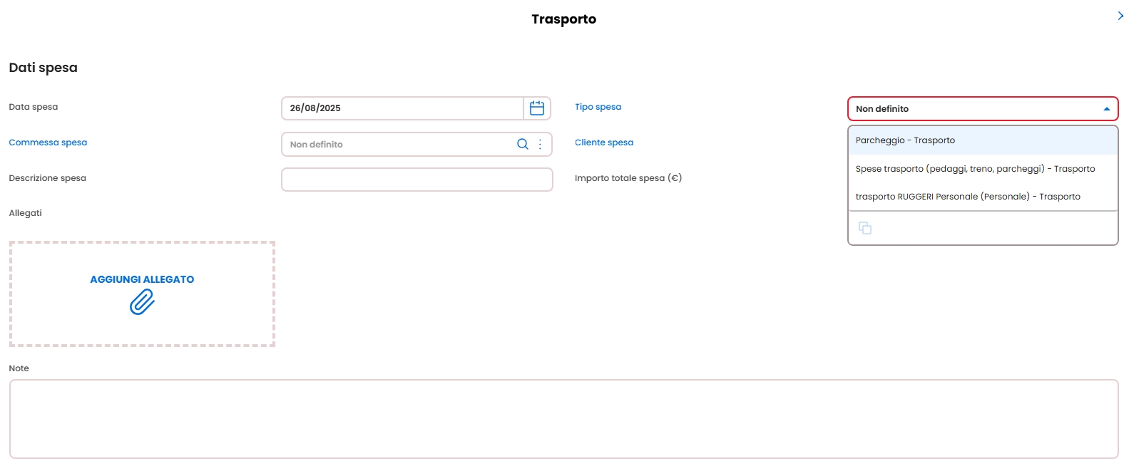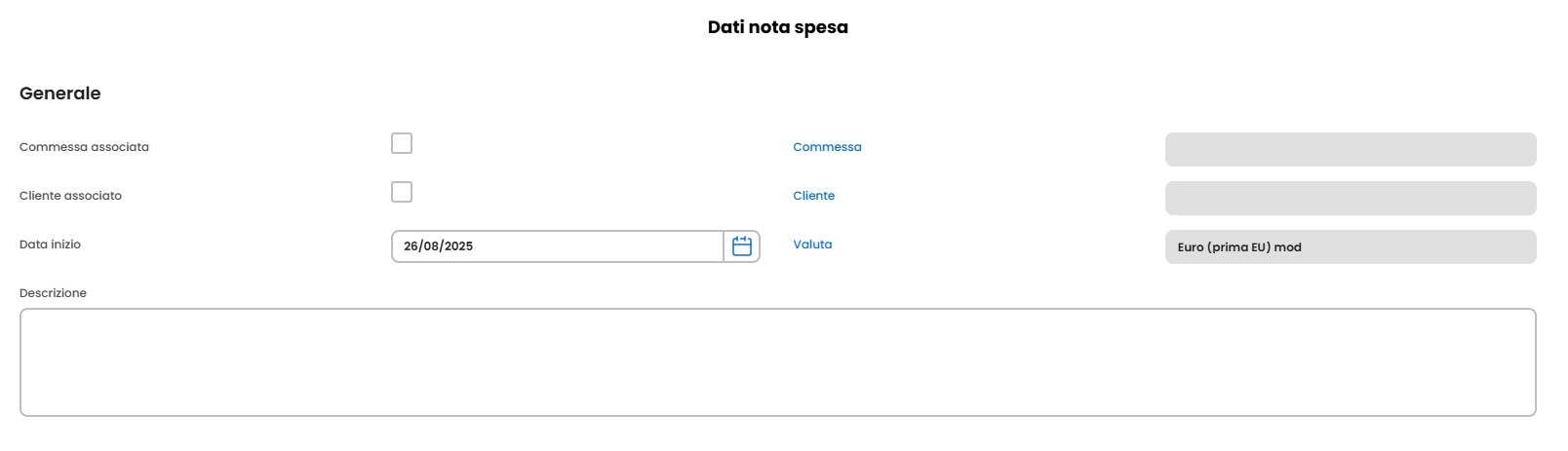 In questa schermata nessun campo e' obbligaotrio. Il campo valuta non e' modificabile in quanto ad oggi le note spese vengono gestite solo in Euro.