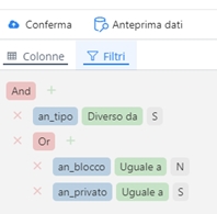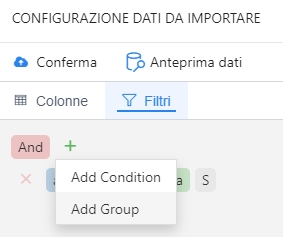 Per aggiungere condizioni di filtro utilizzare la funzione Add Condition, per annidare le condizioni di filtro utilizzare Add Group: