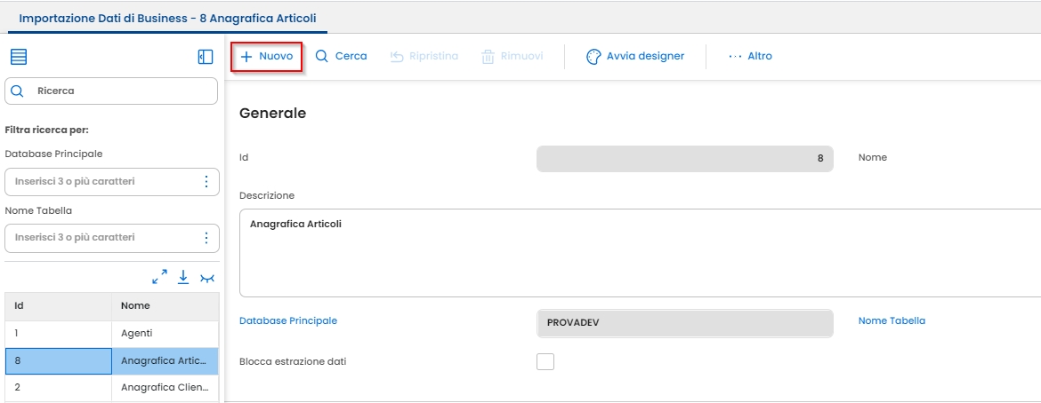 Nota: Se il campo Nuovo non risultasse cliccabile, è necessario prima premere l'icona della lente e selezionare una riga nella tabella sottostante