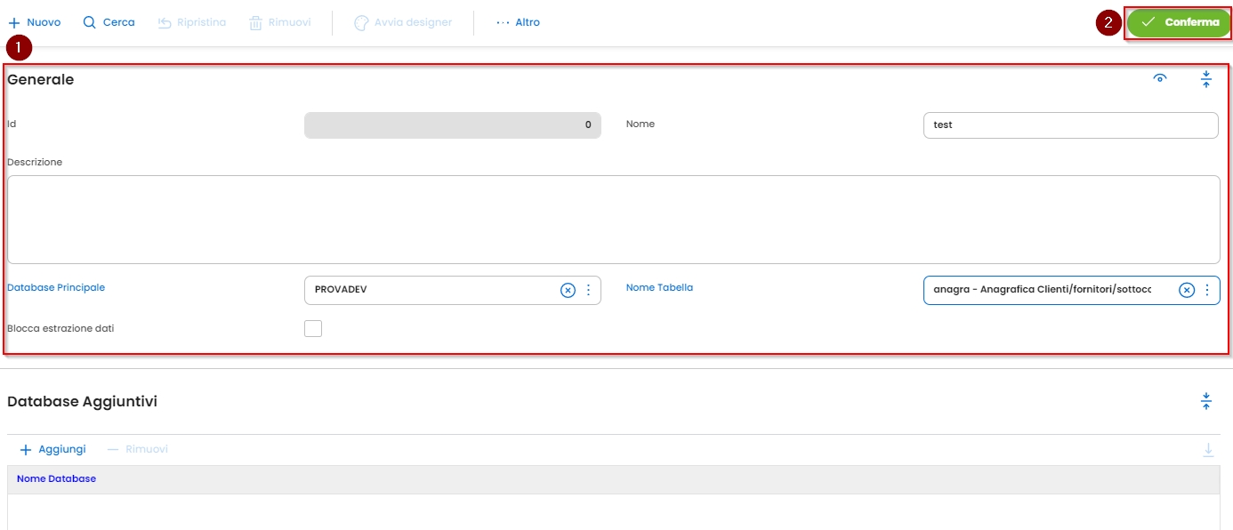 Descrizione, Database Principale e Nome tabella e premere Conferma:
