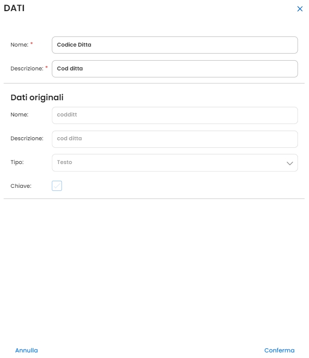 Premendo l'icona a forma di Matita è possibile rinominare i campi in NCT Cloud Tech: