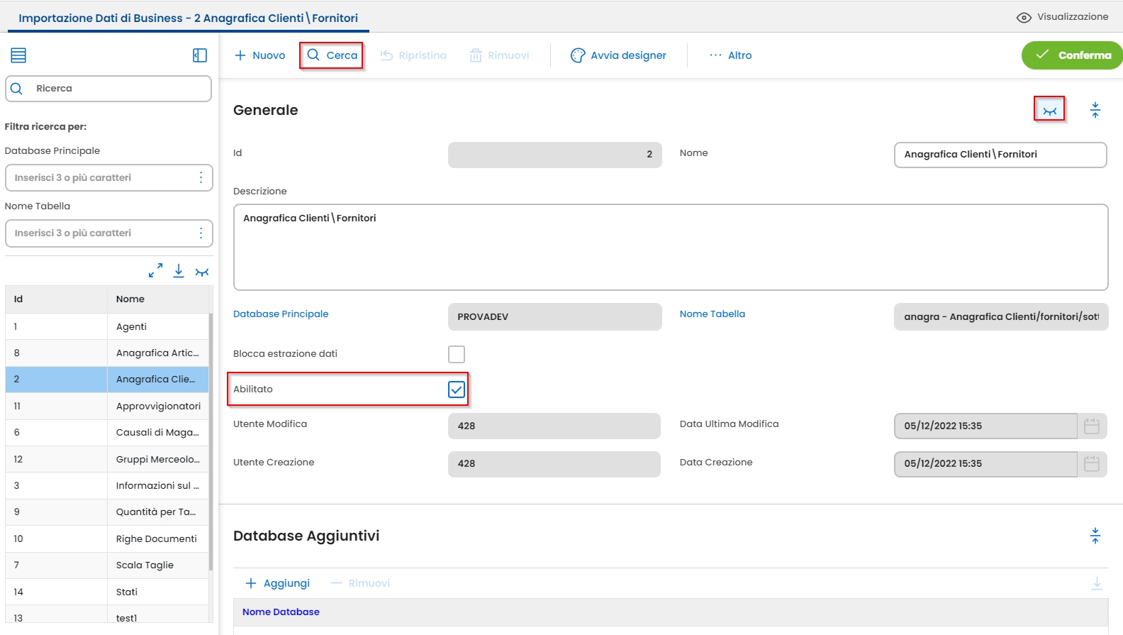 Quando un record viene disabilitato, non sarà più visibile nella lista di navigazione, ma è possibile recuperarlo tramite il pulsante Cerca: