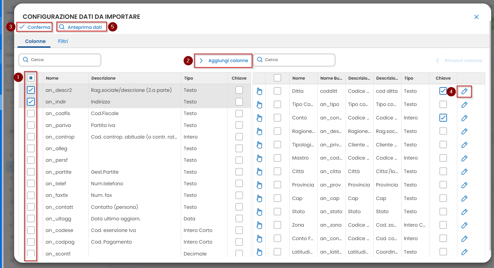 Nella sezione Filtri è possibile eventualmente definire unfiltro per importare una parte dei datii: