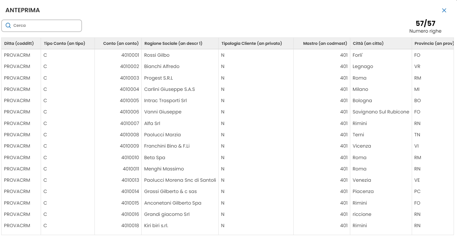 Il pulsante Anteprima Dati mostra le prime 100 righe selezionate con i criteri precedentemente definiti:
