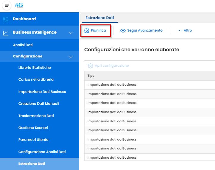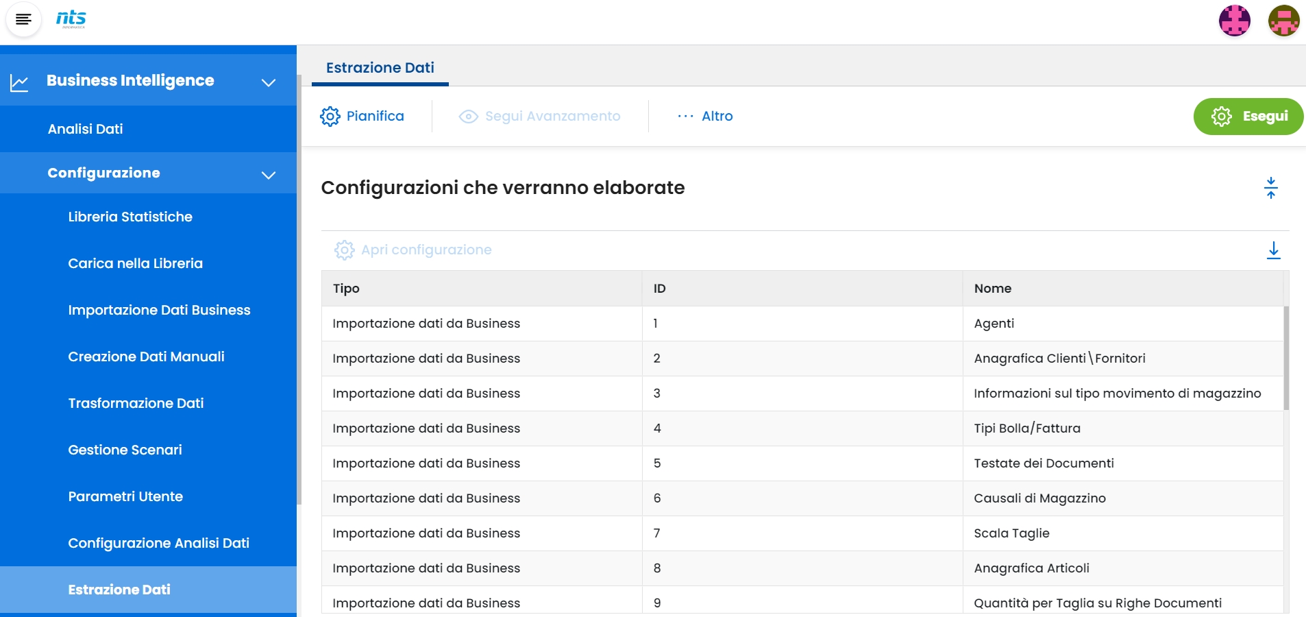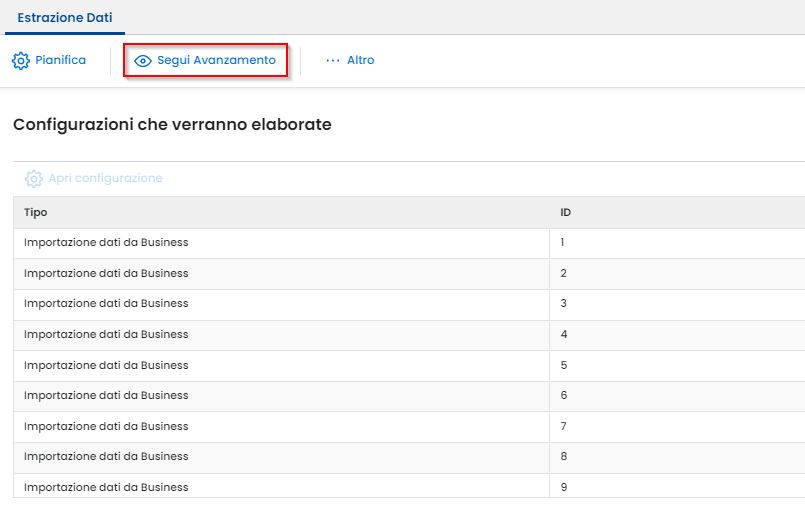 Il programma Estrazione Dati č un servizio che consente di utilizzare i dati esportati nel Cloud e permette di avviare manualmente l'estrazione o di pianificare una sua esecuzione automatica. In questo programma viene mostrato infatti l'elenco degli elementi che devono essere elaborati per la generazione dell'analisi desiderata.