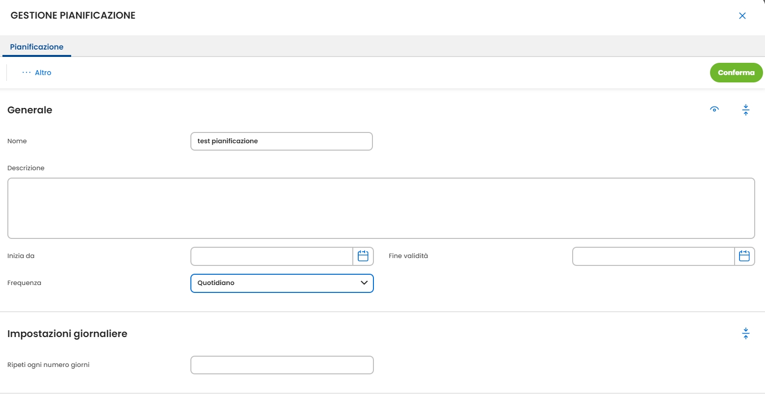 - Creare quindi un nome, eventualmente una descrizione e inserire i parametri di inizio, e frequenza (obbligatori), fine processo (facoltativo) e premere il tasto Conferma: