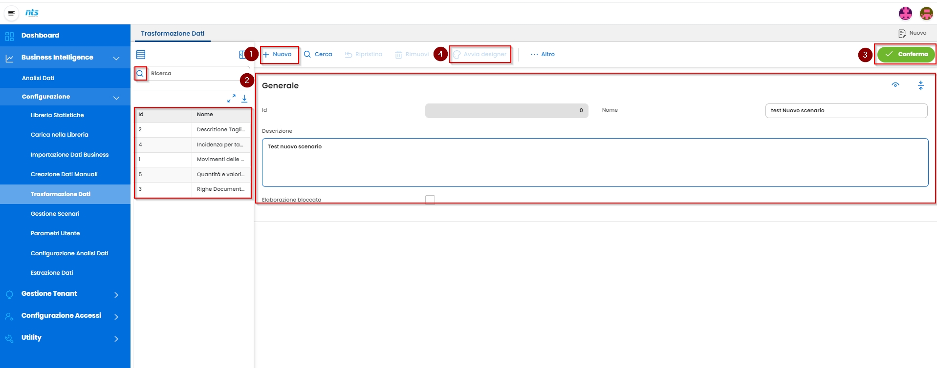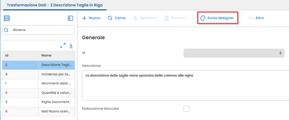 Il menù Trasformazione Dati permette di modificare i dati preparati precedentemente per creare un nuovo set di dati con le regole definite.