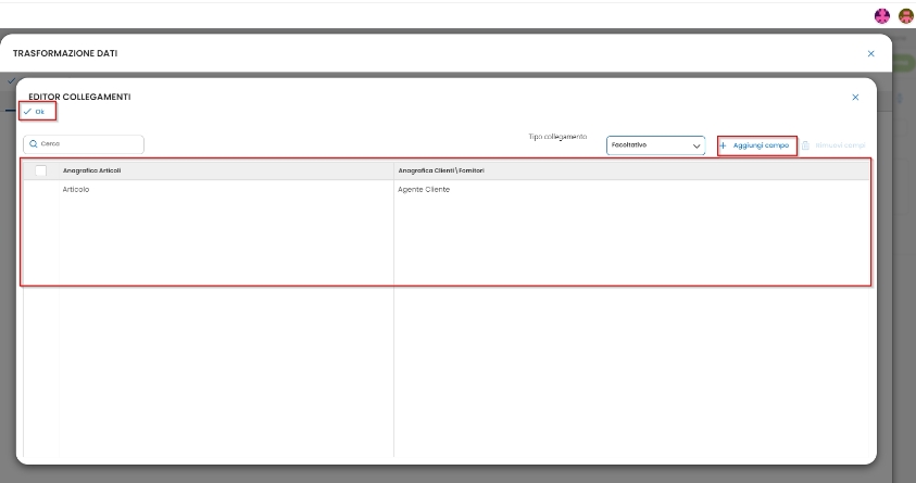 • Per collegare i set di dati inseriti selezionare il pallino verde e unirlo con quello della tabella di destinazione. Una volta effettuata questa procedura si visualizza la pagina Editor Collegamenti. In questa schermata è possibile, tramite il pulsante Aggiungi Campo, selezionare i campi collegati tra le tabelle ed il relativo Tipo di Collegamento (Obbligatorio o Facoltativo). Una volta impostati i collegamenti, premere Ok.