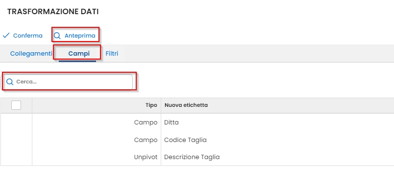 Una volta aggiunti i collegamenti tra i campi, è possibile visualizzarli nel tab Campi. La voce Anteprima mostra le prime 200 righe selezionate e il totale delle righe caricate (Disponibile solo se i dati di partenza sono stati estratti). Il campo Cerca opera esclusivamente sui dati visualizzati