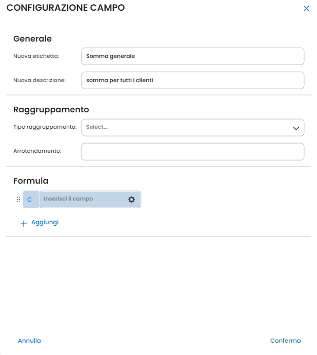 • La funzione Formule permette di generare un nuovo dato effettuando operazioni algebriche (addizione, sottrazione, moltiplicazione e divisione) da un campo di partenza: