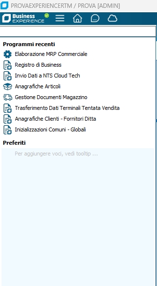 La possibilità di accedere alle voci del menu principale dipende dagli accessi consentiti all'operatore e dai moduli acquistati. Tramite il programma di gestione menu possiamo intervenire modificando il menu ad albero, oppure con la gestione accessi interveniamo sulla visualizzazione in base ad un certo operatore o gruppo. Per selezionare una voce del menu e accedere alla funzione corrispondente si clicca una volta col tasto sinistro del mouse, mentre per accedere al livello successivo del menu si effettua un doppio click sinistro sulla voce corrispondente o si clicca una volta sul simbolo "+" a sinistra della voce. Tramite la prima icona in alto a sinistra è possibile accedere al menu dei Programmi recenti memorizza gli ultimi programmi avviati in ordine cronologico, dal più recente al più vecchio, per un massimo di 8 voci. Dal menu dei programmi recenti è possibile trascinare le voci sul menu Preferiti, tenendo premuti il pulsante SHIFT e il Click sinistro del mouse; per eliminarle si clicca col tasto sinistro del mouse sulla voce da rimuovere, tenendo premuto il tasto SHIFT. Sia il menu dei programmi recenti che il menu personalizzato sono dipendenti dall'operatore, poichè ognuno ha il proprio.
