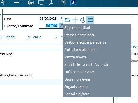 In particolare i settaggi e il comportamento per i 3 casi d'esempio sono: Caso 1) In registro di business aggiungere l'opzione Smartart_conto_#voce con il valore specifico: SmartArt_Conto_8 = Stampa parametrica 45§BS__SPAR.CLS__SPAR§BN__CHIL;45;*N*;;0; In gestione documenti si ottiene il seguente comportamento e cliccando sulla nuova voce personalizzata del menu a tendina si apre la stampa parametrica 45 passandole il valore del conto come filtro: