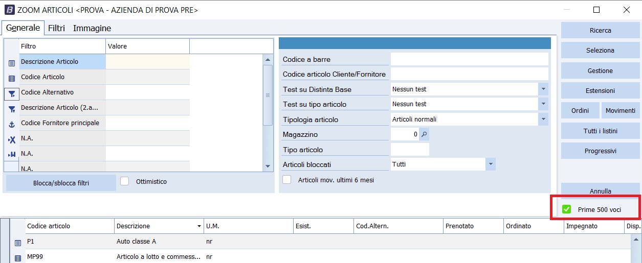La funzione descritta non opera su zoom: ditte, ABI,CAB, clienti e fornitori, leads, destinazioni diverse, artico, cespiti, commesse, ubicazioni, configuratore di prodotto, ordini, documenti di magazzino, offerte, lotti, matricole, distinte basi, codici nomenclatura combinata, campi del datawarehouse, procedure di import/export, catalogo fornitori, anagrafiche percipienti, organizzazione, schemi di commessa, attività PM, ecc ... Zoom con limitazione alle voci ricercate Sugli zoom relativi a tabelle che possono contenere un numero molto elevato di record (anche centinaia di migliaia e oltre) è stata aggiunta, per impostazione predefinita, una limitazione al numero di voci che vengono mostrate nella griglia dello zoom. Lo scopo è quello di non bloccare la macchina (e il server) quando inavvertitamente si procede alla ricerca senza applicare nessun filtro su tali zoom. Per impostazione predefinita vengono visualizzati i primi 500 record. Gli zoom interessati da questo intervento presenteranno questo nuovo flag: