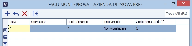 NB: se non si indica ne operatore ne ruolo vuol dire che l'impostazione vale per tutti gli utenti/ruoli. Nella selezione delle esclusioni al momento della visualizzazione dello zoom la priorità è: ditta, utente, ruolo, tipo vincolo ='Visualizza', tipo vincolo ='Non visualizza'. Negli zoom che hanno questa funzionalità è stato aggiunto un pulsante 'Esclusioni' per accedere a questa nuova tabella impostando direttamente il nome tabella che lo zoom sta visualizzando, e un flag del tipo 'Ignora esclusioni' (l'autocompletamento si comporterà come lo zoom, ma non ci sarà la possibilità di 'ignorare' le esclusioni).