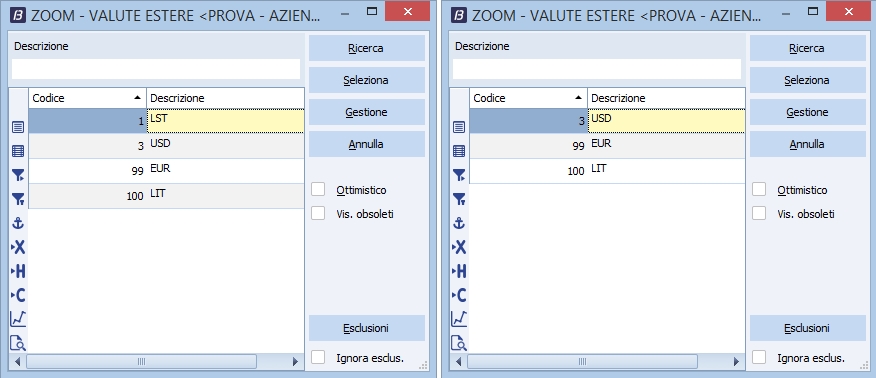 Note per programmatori: il limite al richiamo di programmi da questo menu è che il programma da chiamare deve essere predisposto per essere chiamato in modo diretto ricevendo come valore in ingresso i parametri passati (e occorre conoscerne la struttura). Ad esempio la stampa dei partitari era già predisposta, mentre la stampa prima nota è stata modificata già a standard nella FORM_ActivatedFirst. Se si vuole personalizzare l'avvio del programma, basta ereditare la funzione di lancio "BN__CHIL.SmartArtRun" oppure se vuole personalizzare da codice le voci che appaiono nel menu Smart Art Run (senza usare le opzioni di registro) basta che erediti "BN__CHIL.GetSmartArt". Nuova funzionalità su zoom standard (BN__HLTB) e autocompletamento da tabelle semplici (TABXXXX) Con questa funzione gli zoom semplici possono non visualizzare alcune voci, in base al contenuto della tabella 'Esclusioni' (ESZOOM). Lo scopo è quello di fornire una interfaccia unificata dove poter indicare quali voci non devono/devono essere visibili per l'operatore che ha chiamato lo zoom al fine di facilitargli il lavoro. Ovviamente la funzionalità opera solo negli zoom/autocompletamento, per cui da parte del programma non viene fatto nessun controllo/blocco se l'operatore digita il codice invece che richiamarlo con lo zoom.