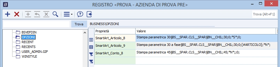 Ovviamente '*' è un carattere jolly che non può essere utilizzato per altri scopi nella composizione della stringa, esattamente come il carattere '§'. Se nel nome del programma è presente un '.' (che separa il nome della dll dalla classe), verrà eseguito un child di business, diversamente verrà eseguita la query indicata come parametro ed il risultato verrà visualizzato come messaggio di tipo informativo ( attenzione: se la query non inizia con SELECT verrà fatta una EXECUTE). Le query vengono eseguite sempre e solo nel database azienda (no archivio procedura). Seguono alcuni esempi di opzioni di registro: QUERY SELECT SmartArt_Conto_8 = QUERY SELECT DESCR MOLTO LUNGA§QUERY§SELECT codditt, an_conto, an_descr1 FROM anagra where codditt = '[#DITTA]' AND an_conto = *N9* QUERY DI UPDATE SmartArt_Conto_9 = QUERY UPDATE§query§UPDATE anagra set an_tipo = 'C' WHERE an_conto = *N* and an_tipo = 'C' and codditt = '[#DITTA]' APRI STAMPA PARTITARI SmartArt_Conto_10 = Stampa partitari§BSCGPART.CLSCGPART§T;0000; ;01/01/2014;31/12/2014;*N9*;*N9*;0; APRI SCADENZE APERTE SmartArt_Conto_10 = Scadenze aperte§BSCGSCAD.CLSCGScad§APRI;BNTFSTTE;*N9*;E;N;01/01/1900;31/12/2099;N; APRI STAMPE PARAMETRICHE/QUERY