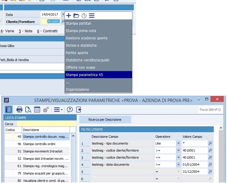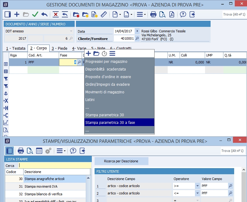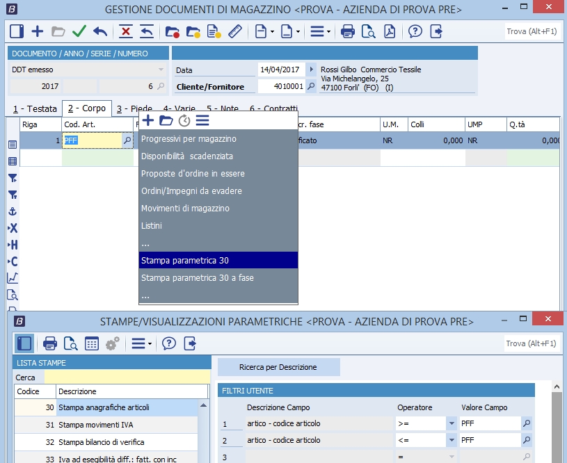 Caso 2) Settaggio dell'opzione di registro: SmartArt_Articolo_8 = Stampa parametrica 30§BS__SPAR.CLS__SPAR§BN__CHIL;30;0;*S*;0; In gestione documenti si ottiene il seguente comportamento e cliccando sulla nuova voce personalizzara nel menu a tendina si apre la parametrica 30 con impostati i filtri per codice articolo: