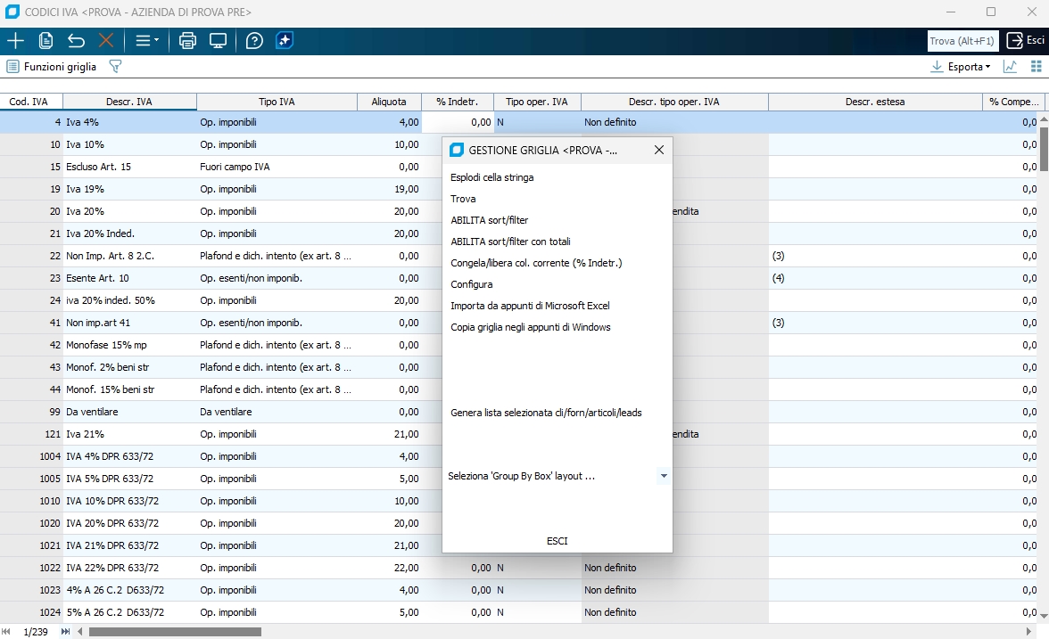 In Business tutte le griglie hanno caratteristiche e sono funzionalità comuni di ordinamento, filtraggio, raggruppamento, totalizzazione e esportazione. Partiamo col descrivere le caratteristiche più comuni che troviamo nel menu di gestione delle griglie attivabile tramite Ctrl+Click SX in un punto qualsiasi sulla griglia.
