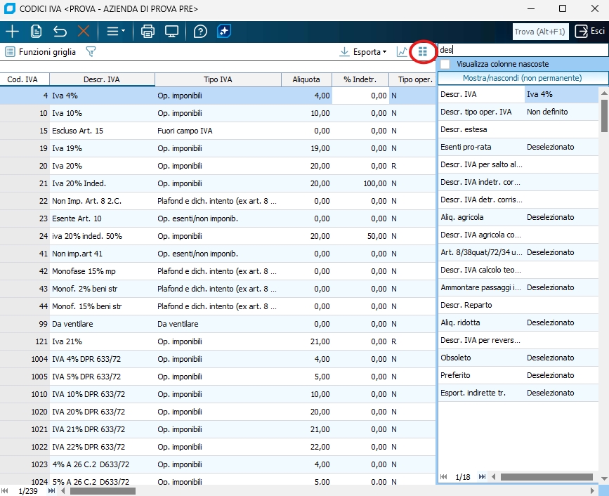 Sulla sinistra della griglia, tramite la pressione del tasto visualizza/nascondi menu, è possibile accedere alle funzioni di griglia ad accesso rapido. Queste voci sono attivabili con un semplice click del mouse, attendendo qualche secondo sulle varie icone con la freccia del muose appare la descrizione della funzione. Le ultime voci corrispondono ai raggruppamenti salvati nel menu di griglia se presenti (NB: i layout gestiti sono al massimo 9). Le prime due funzioni che troviamo su questo menu sono: Esplodi cella str. (Alt+F1) - tramite questa funzione, disponibile per campi contenenti descrizioni, è possibile visualizzare in una finestra più ampia il contenuto della cella sulla quale si è posizionati (utile per campi note) Trova (Ctrl+Alt+F) - consente di trovare un particolare valore nella colonna desiderata, una volta lanciata la ricerca è possibile continuare a ricercare nella stessa colonna il testo precedentemente imputato premendo la combinazione di tasti Ctrl+F oltre a queste due voci, attivabili anche dalla sequenza di tasti di scelta rapida descritti fra parentesi direttamente da griglia, esiste la funzione di Trova colonna (Ctrl+\) o apposita icona in alto a destra in ogni griglia che apre a destra della griglia una lista contenente tutte le colonne presenti in griglia, in ordine di come sono le colonne. Sopra alla griglia appare il campo 'cerca' che permette di evidenziare le colonne che contengono un determinato testo. La funzione è utile anche per poter vedere senza muoversi sulla griglia il contenuto delle celle della riga su cui si è posizionati, oppure nascondere la visualizzazione della colonna selezionata (impostazione temporanea, al riavvio della maschera la visualizzazione tornerà al default).
