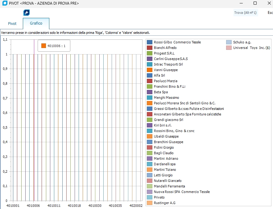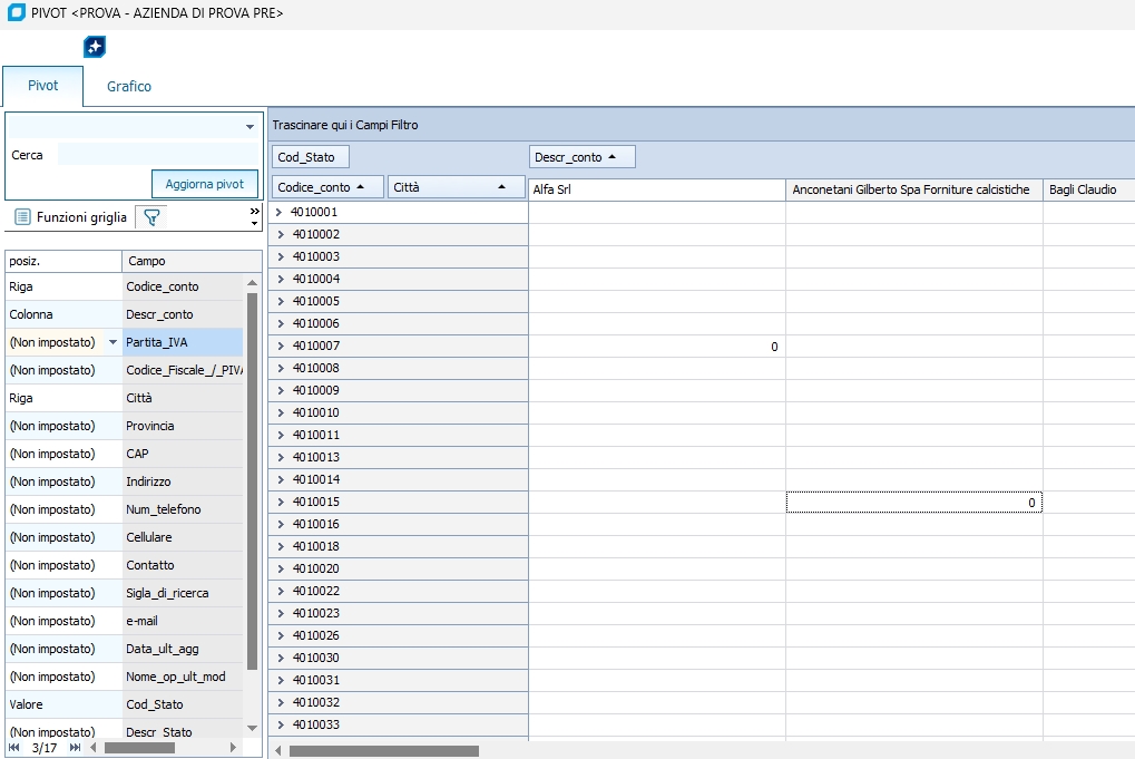 Raggruppamenti e totalizzatori Per comprendere meglio le proprietà di raggruppamento e totalizzatori di una griglia procediamo con esempio sulla griglia della stampa partitari. Innanzitutto attiviamo con la voce ABILITA sort/filter con totali la relativa modalità, ora procediamo selezionando dal menu di colonna (compare cliccando con il tasto destro sul nome della colonna) la voce Raggruppa per questa colonna abilitando la modalità raggruppamenti. A questo punto la griglia visualizzerà nella parte in alto la regione dei raggruppamenti, mentre nel piede il dati relativi ai totalizzatori. Procediamo ora col raggruppare per esempio per colonna descrizione causale come mostrato sopra; nella nuova finestra mostrata sotto sarà possibile continuare a raggruppare per altre colonne, oppure togliere un raggruppamento tramite la voce Separa. Le voci Espandi Tutto e Comprimi Tutto espandono e collassano totalmente il gruppo selezionato. Per quanto riguarda i totalizzatori basta semplicemente posizionarsi sulla riga di piede sotto la colonna da totalizzare e sempre cliccando con il tasto destro del mouse appare il menu dei totalizzatori che permette di scegliere fra Somma, Min, Max, Conta e Media. NB: l'attivazione dei totalizzatori va fatta subito non è possibile attivare i totalizzatori dopo aver impostato uno o più raggruppamenti. Una volta impostato il layout della griglia desiderato anzichè impostarlo nuovamente ogni volta che serve, è possibile utilizzare la funzione di Salva 'Group By Box' layout. Per richiamare un layout precedentemente salvato basta selezionarlo nella combo box Seleziona 'Group By Box' layout ..., per cancellare basta invece caricare un layout salvato e selezionare la voce Cancella 'Group By Box' layout corrente. Genera lista selezionata clienti / fornitori / articoli leads Se effettuiamo un Ctrl+Click SX per richiamare il menu di griglia quando è selezionata una colonna di tipo articolo o cliente/fornitore, possiamo creare una nuova lista selezionata con l'elenco degli articoli o clienti/fornitori o leads, attualmente visualizzati su quella colonna di griglia. Una volta selezionata la voce 'Genera lista selezionata cli/forn/articoli' basta inserire codice e descrizione da attribuire alla lista da creare, consultabile poi all'interno del programma Liste selezionate articoli o Liste selezionate clienti/fornitori . Pivot Una volta che sulla griglia sono presenti i dati, si può utilizzare la funzione pivot, per generare statistiche grafiche dei dati presenti.