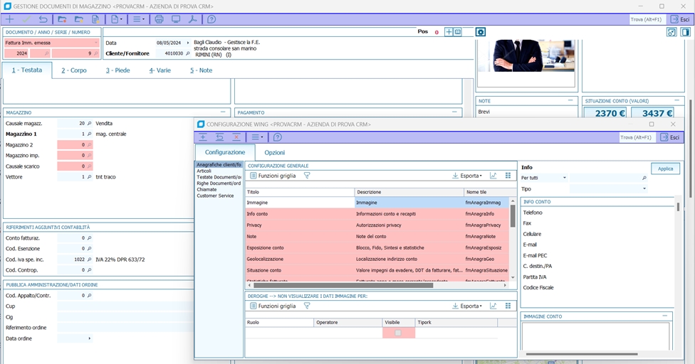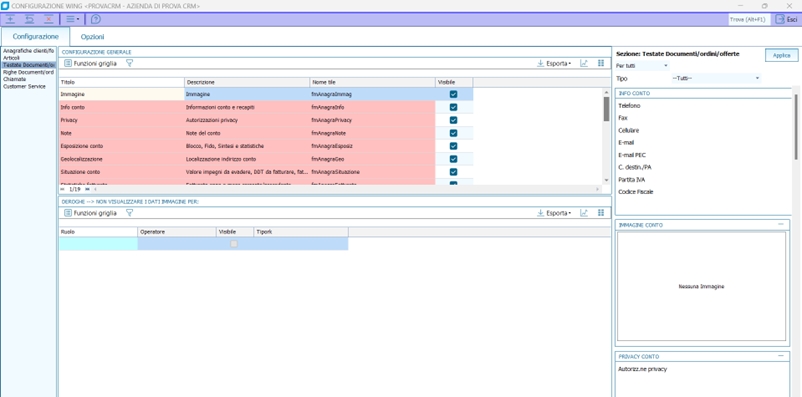 Tramite il pulsante «configura ala» collocato in alto a sx, è possibile personalizzare le autorizzazioni sui singoli tile, grazie al nuovo programma Configurazione wing (BN__TILE) avviabile anche da Menù, che permette di decidere per ogni tile cosa vedere e in quale contesto. Ad esempio, l'immagine relativa al conto, dev'essere visibile per le testate documenti ma non per le righe del documento, perché considerate due sezioni diverse. Oppure, la geolocalizzazione è resa visibile in Anagrafica cliente, ma non in Gestione customer service.