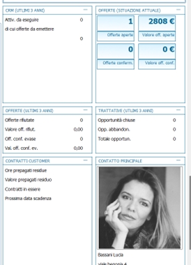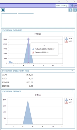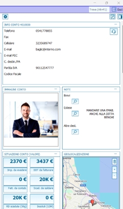 Tra i dati visualizzabili annovariamo: Geolocalizzazione, l'immagine sia del conto che dell'articolo e del contatto principale, la Situazione Conto con qualche dato aggiuntivo e con la possibilità di aprire la griglia, le Statistiche Fatturato e Ordinato con grafici interattivi, la Disponibilità Scadenzata articolo, i progressivi dell'articolo, se presente il modulo Customer e/o Crm presenti anche i dati relativi alla situazione offerte/trattative e contratti customer.