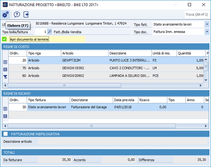 Questo documento deve avere una causale di magazzino con 'Aggancio costi al progetto' uguale a 'Costo in positivo'; vedere la sezione 3.7.4 di questo manuale per ulteriori informazioni.