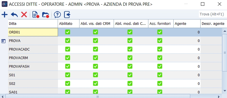 Tramite questa funzione s'imposta a quali ditte l'operatore può accedere. Diversificando per ditta, possiamo impostare dei livelli di accesso sui singoli moduli o programmi. |