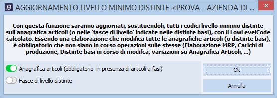 Se si utilizza l'utility Rivalorizzazione carichi/scarichi di produzione è obbligatorio utilizzare questa funzione per aggiornare il livello minimo distinte.