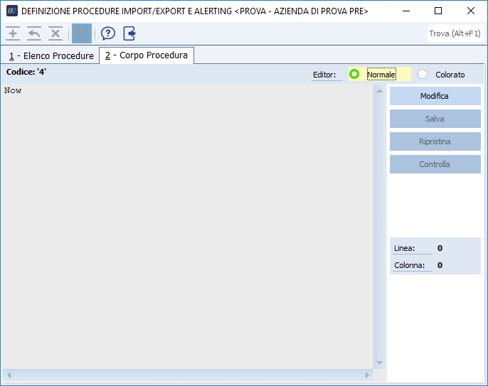 Normalmente l'editor delle procedure è disabilitato; per abilitarlo premere sul pulsante 'Modifica'. Terminata la modifica o l'inserimento della nuova procedura è possibile salvare o ripristinare il tutto; il pulsante controlla, se abilitato, consente di controllare la sintassi solo per procedure di tipo Sub, Function o Expression.
