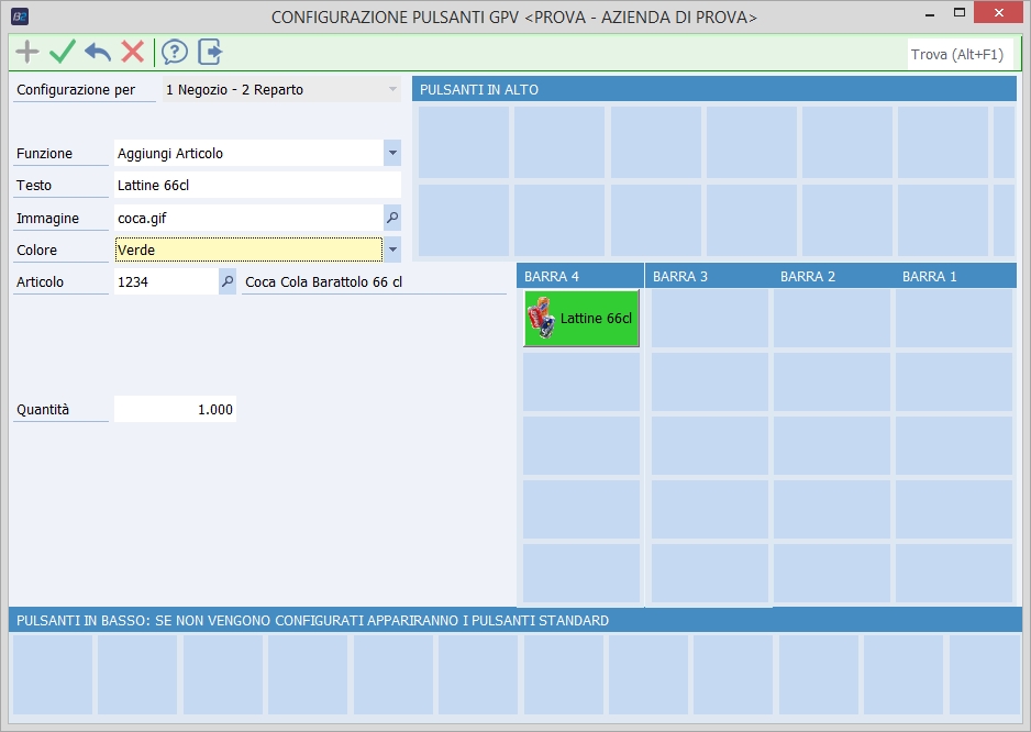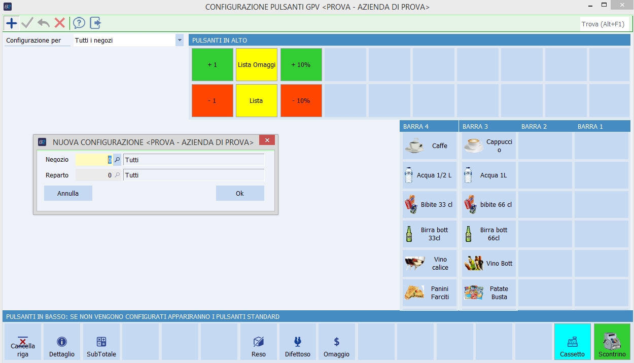 Moduli richiesti: Gestione Punto Vendita Extended Questo programma permette di configurare e aggiungere pulsanti alla maschera di Gestione Punti Vendita (il numero dei pulsanti visualizzabili varia con le dimensioni dello schermo), le configurazioni possono essere condivise per tutti i Negozi\Reparti