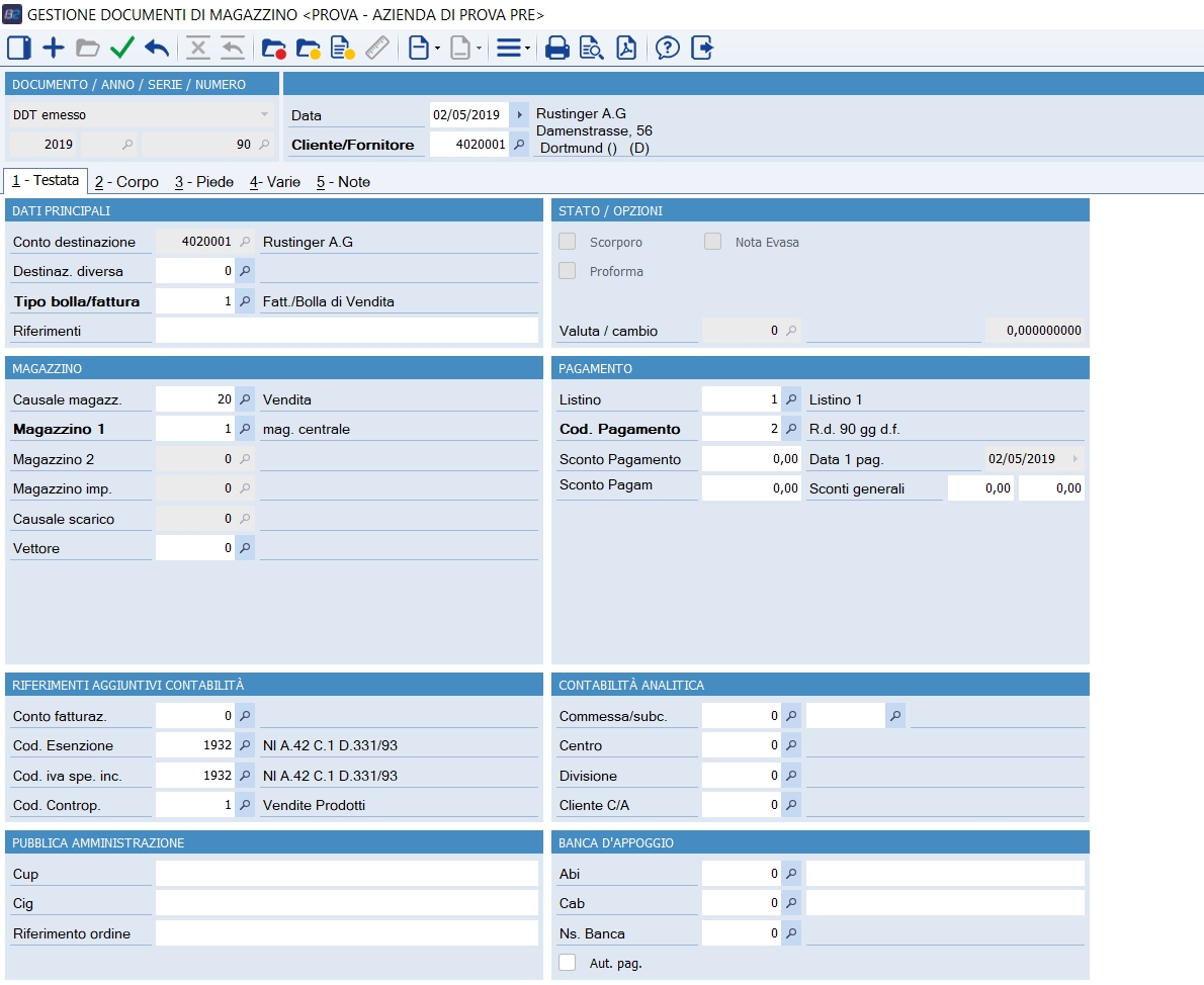 1- TESTATA (campi obbligatori) Codice cliente/fornitore Rappresenta il mittente principale o il destinatario ultimo della merce. Premere F5 per lo ZOOM sui Clienti/Fornitori. Tipo bolla/fattura Può essere utilizzato per precaricare alcune informazioni di testata, distinguere i documenti di vendita da quelli di acquisto in base alla causale associata, i documenti in Conto lavoro da quelli in conto visione , le bolle da fatturate da quelle che non lo devono essere, i documenti di acconto da quelli di saldo acconto (vedi Tipi Bolle/fatture) Causale Magazzino Permette di movimentare le esistenze e i progressivi di magazzino per ciascun articolo inserito, + per documenti di acquisto, - per quelli di vendita, doppia, cioè una causale di scarico con causale secondaria agganciata di carico, se si tratta di documento di movimentazione su due magazzini, scarico un magazzino e contemporaneamente carico un altro magazzino, per cui va indicato anche il "Magazzino Carico" (vedi Causali di Magazzino - Magazzini e causali di movimentazione - Causali di magazzino e tipi bolle/documenti) Magazzino 1 Magazzino da scaricare, se è indicata una causale di scarico, oppure il magazzino da caricare, se la causale è di carico. Per Magazzino si intende anche un Deposito/Terzista. Magazzino 2 Magazzino di carico o scarico se indicata una causale doppia, su tale magazzino opera la causale secondaria agganciata alla "Causale di carico/scarico Magazzino Impegni Se si sta inserendo un Carico da produzione, indica il magazzino in cui è effettuato lo scarico dei componenti e il disimpegno dei materiali, qualora impegnati, cioè il magazzino in cui è avvenuta la trasformazione fisica da componenti in composto; se lavorazione presso terzi, è il magazzino associato al terzista; se lavorazione interna, come di norma, è il magazzino in cui è effettuato anche il carico del PF, per esempio 1 = Ns. Stabilimento (vedi anche Carico da produzione automatico al salva di un documento di vendita). Causale Scarico Solo per i documenti di tipo Carico da produzione, è la causale con cui sarà effettuato lo scarico dei componenti utilizzati. Codice Pagamento É il codice relativo al pagamento applicato sulla transazione, se di "Tipo" diverso da "contanti" verranno create le relative scadenze di magazzino (vedi Forme di pagamento) 1- TESTATA (informazioni aggiuntive)